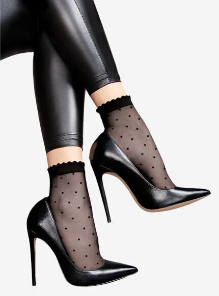 Zestaw cienkie skarpetki damskie z trampkami lub butami na obcasach, z tiulową spódniczką lub skórzanymi legginsami.